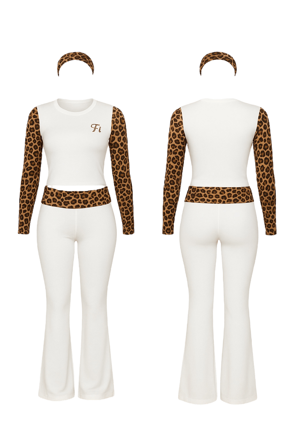 Featuring a fitted long sleeve top, flared leggings, and a matching leopard headband, this set combines comfort with sleek, feminine style. Designed to hug your body in all the right places, it’s perfect for effortless chic looks at home or on the go.